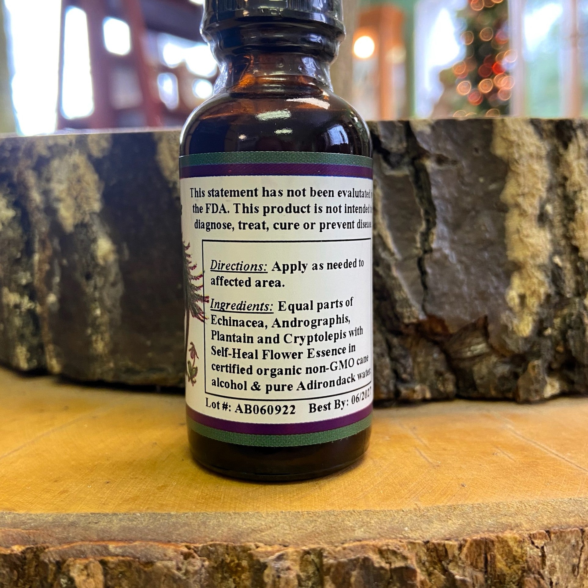 Echinacea, Andrographis, Plantain, and Cryptolepsis with Self-Heal Flower Essence in certified organic non-GMO cane alcohol and pure Adirondack water.