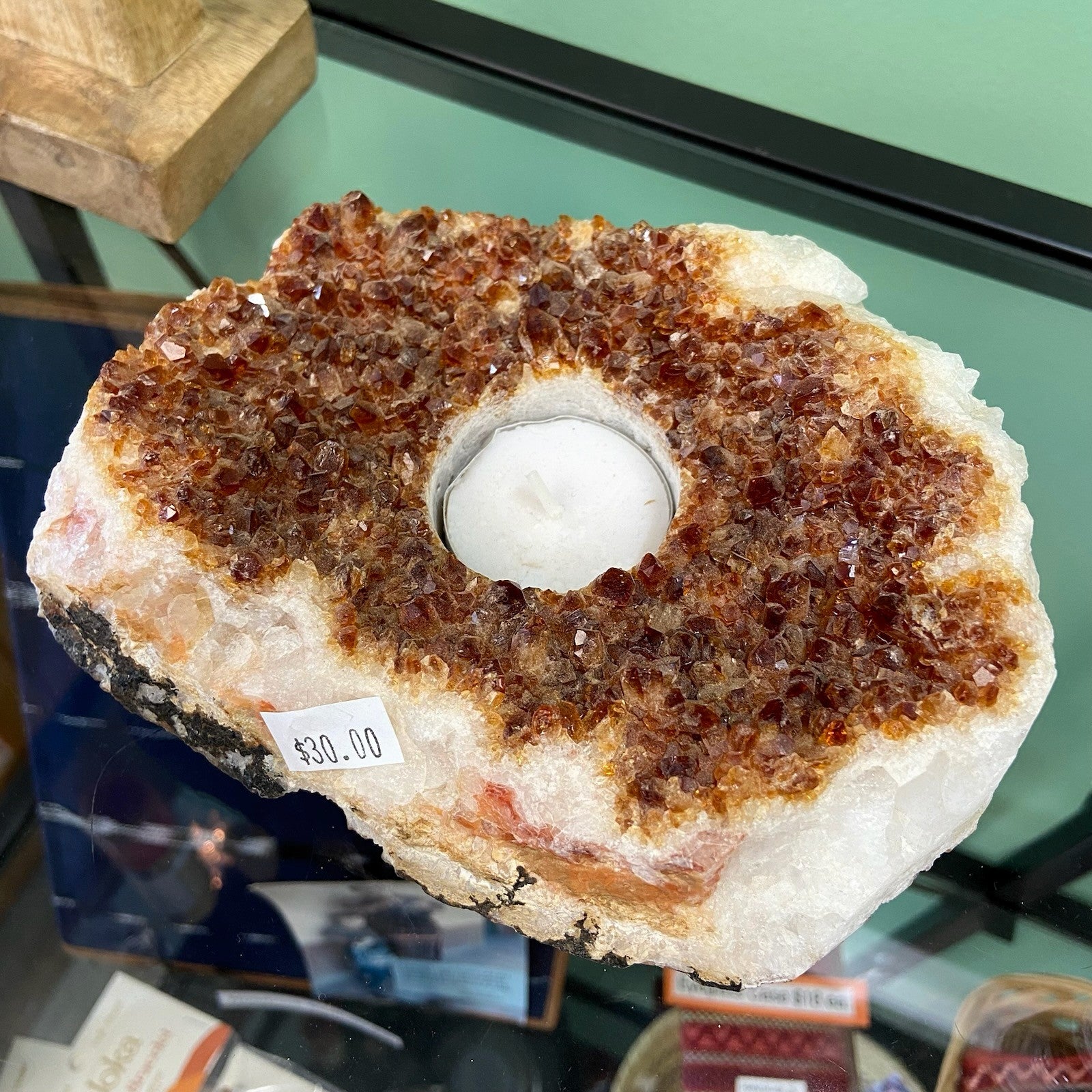Citrine is a gemstone of light, happiness and abundance. It is a powerful gemstone for manifestation and can help you achieve your goals and bring your intentions to life. Citrine helps to bring and maintain prosperity. Around 4-5" wide and 1.25" tall. Holds a regular tea light candle, one will be included.