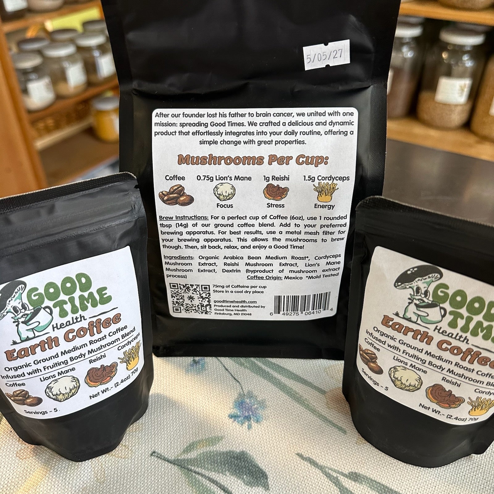 Good Time Health's Earth Coffee is made with an Organic Medium Roast Ground Coffee (Mold Tested), with Arabica Beans sourced from Mexico. With notes of brown sugar, cashews and chocolate, Earth Coffee blend is great for everyone from the occasional coffee drinker, to the coffee connoisseur.