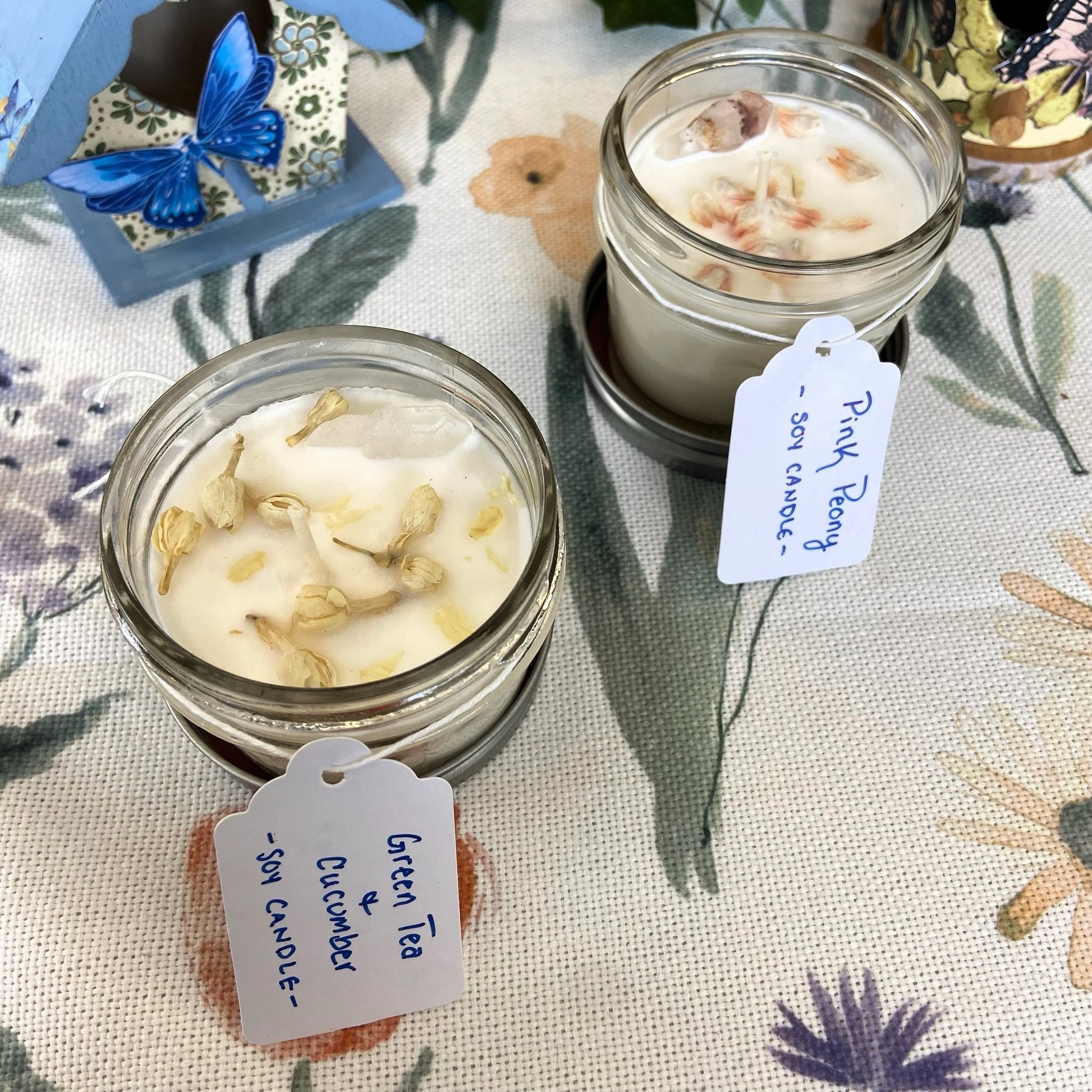 Our handmade soy wax candles are crafted with care and intention, using natural soy wax, high-quality fragrance oils, and adorned with handpicked crystals and herbs. Each one is designed to elevate your space, soothe your senses, and bring a touch of magic into your everyday rituals.
