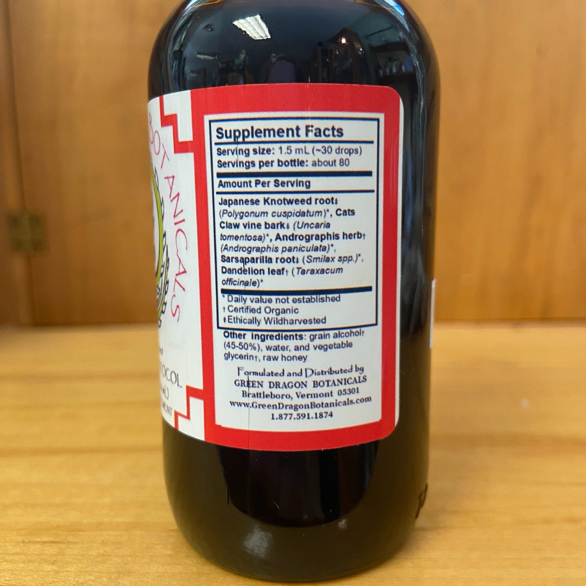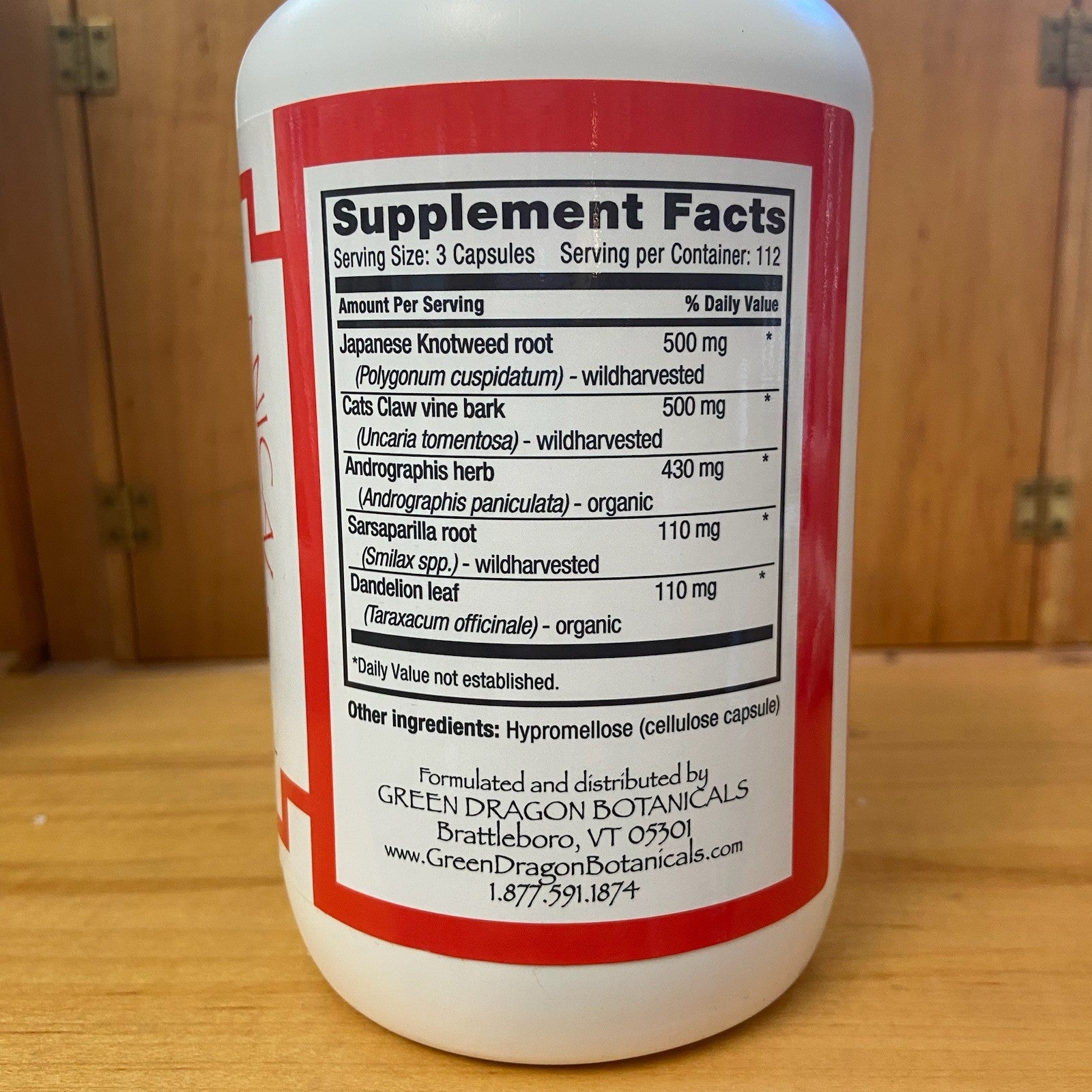 Japanese Knotweed, Cat’s Claw bark, Andrographis herb, Dandelion herb & Sarsaparilla.