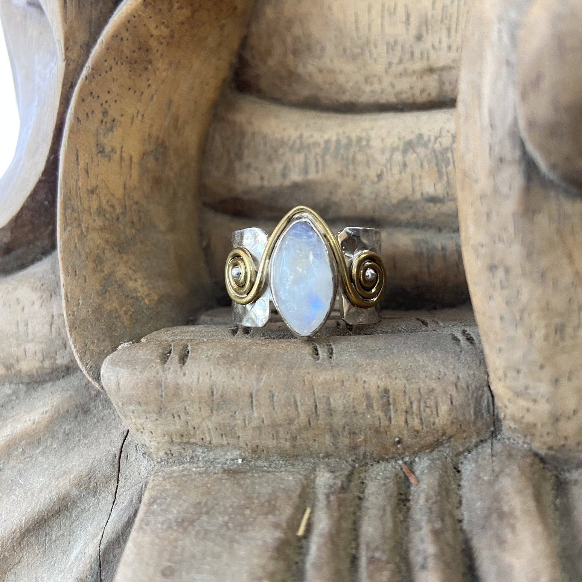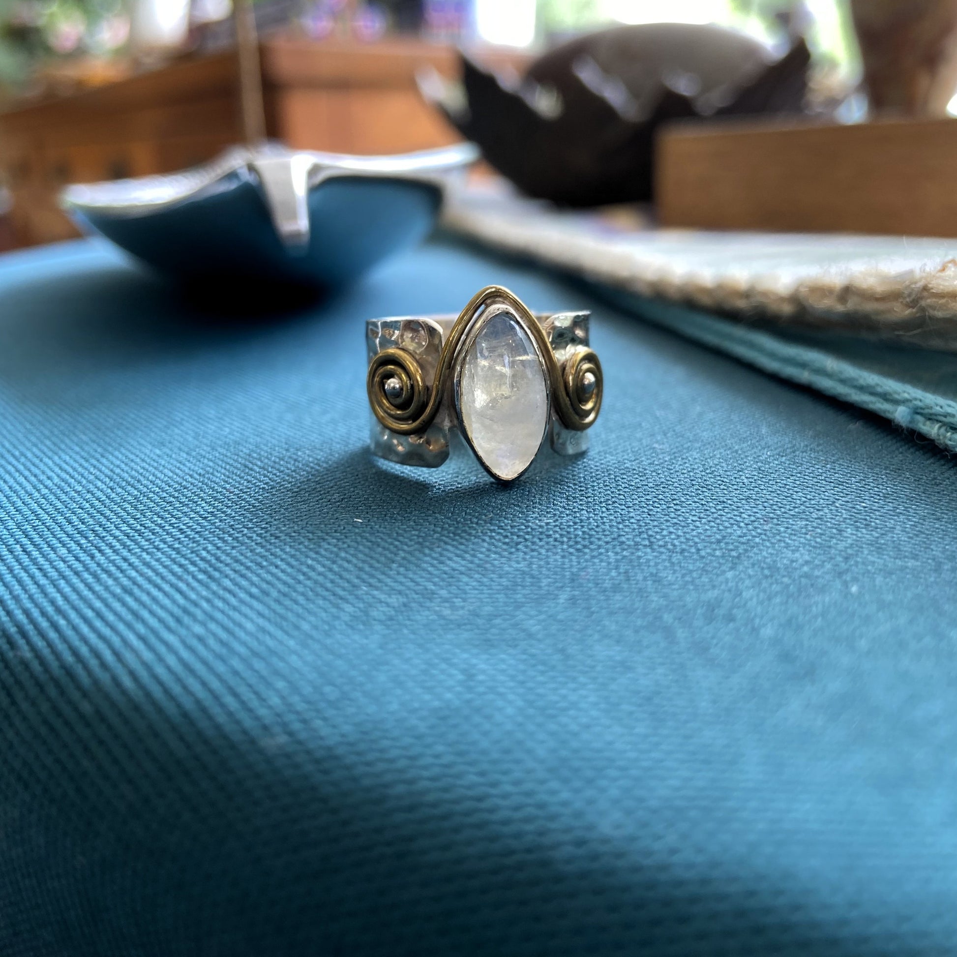 This delicate ring features a shimmering moonstone cut in an elegant marquise shape, known for its eye-catching silhouette and graceful lines. With every movement, the moonstone flashes soft hues of blue and white—capturing light like moonbeams on water.