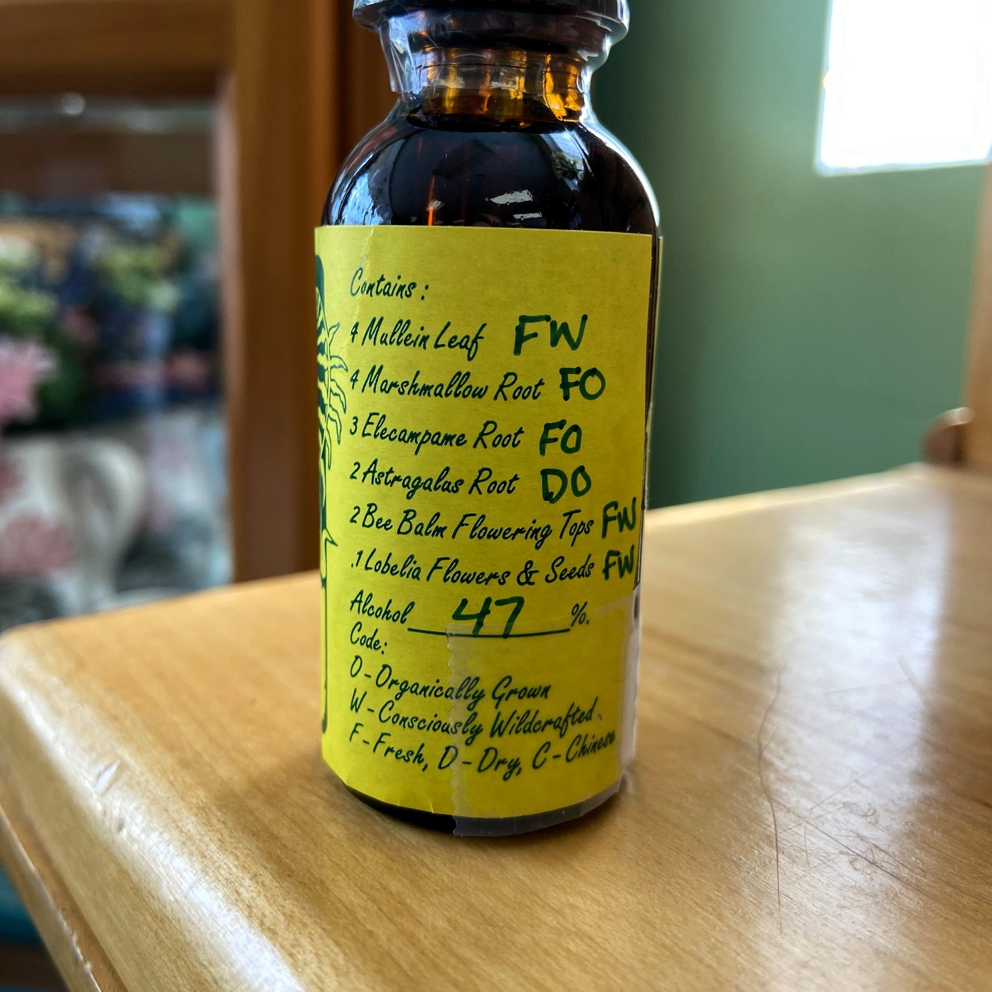 A blend of Mullein leaf, Marshmallow root, Elecampane root, Astragalus root, Bee Balm, Lobelia extracts.