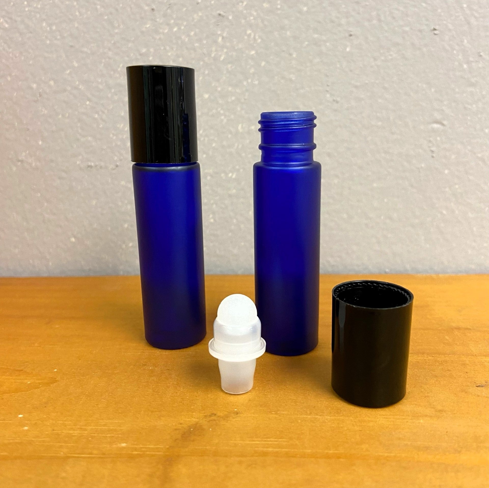 Frosted blue cobalt, roll on applicator container with a black cap (.35 oz).