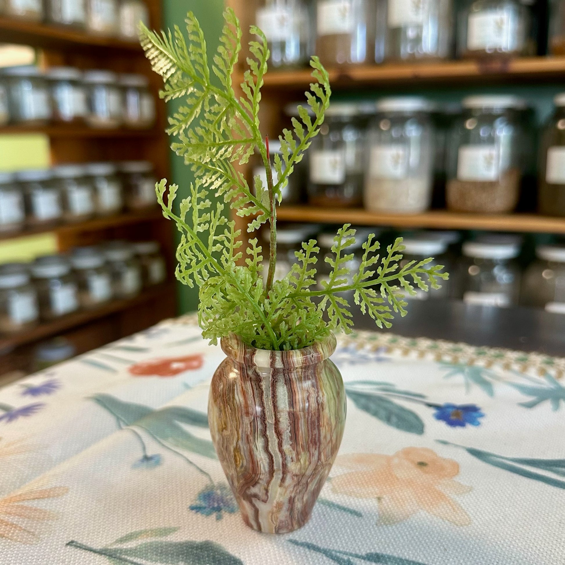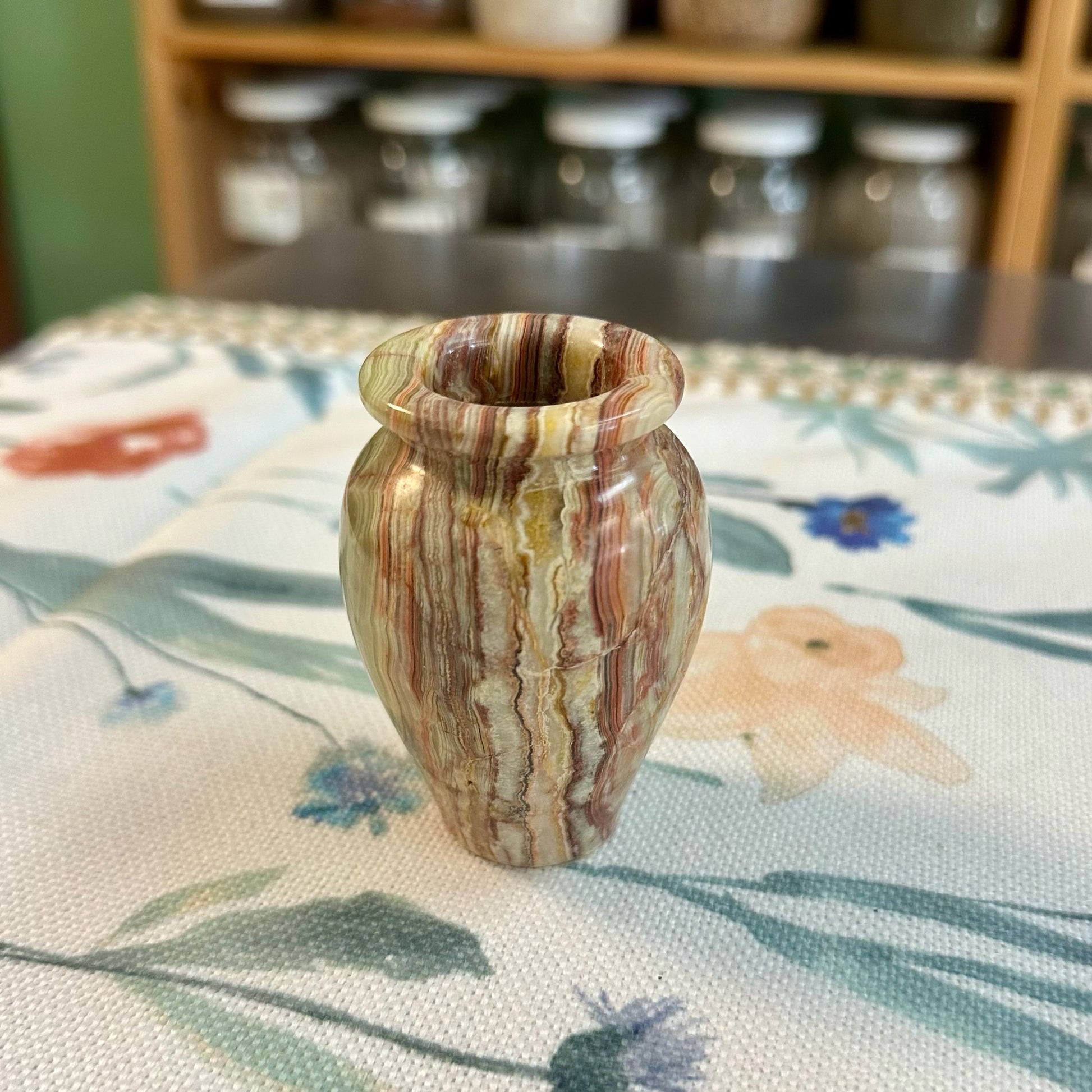 Crafted from richly banded Sardonyx, this petite vase brings grounding energy and timeless style to your space. Its natural patterns and warm tones make it perfect for holding dried florals, small arrangements, or simply as a unique decorative accent.