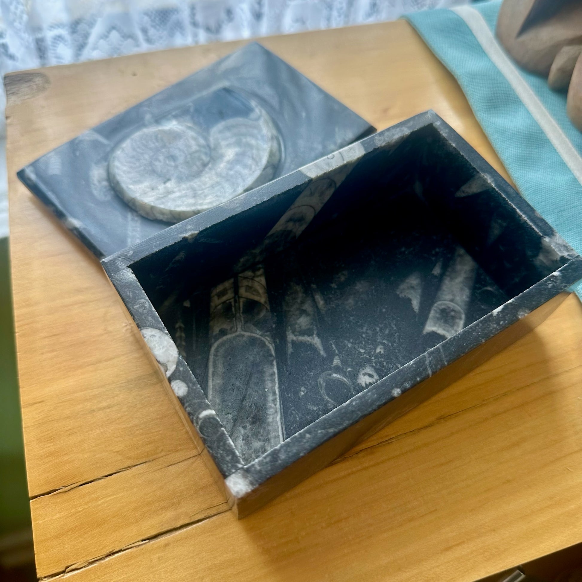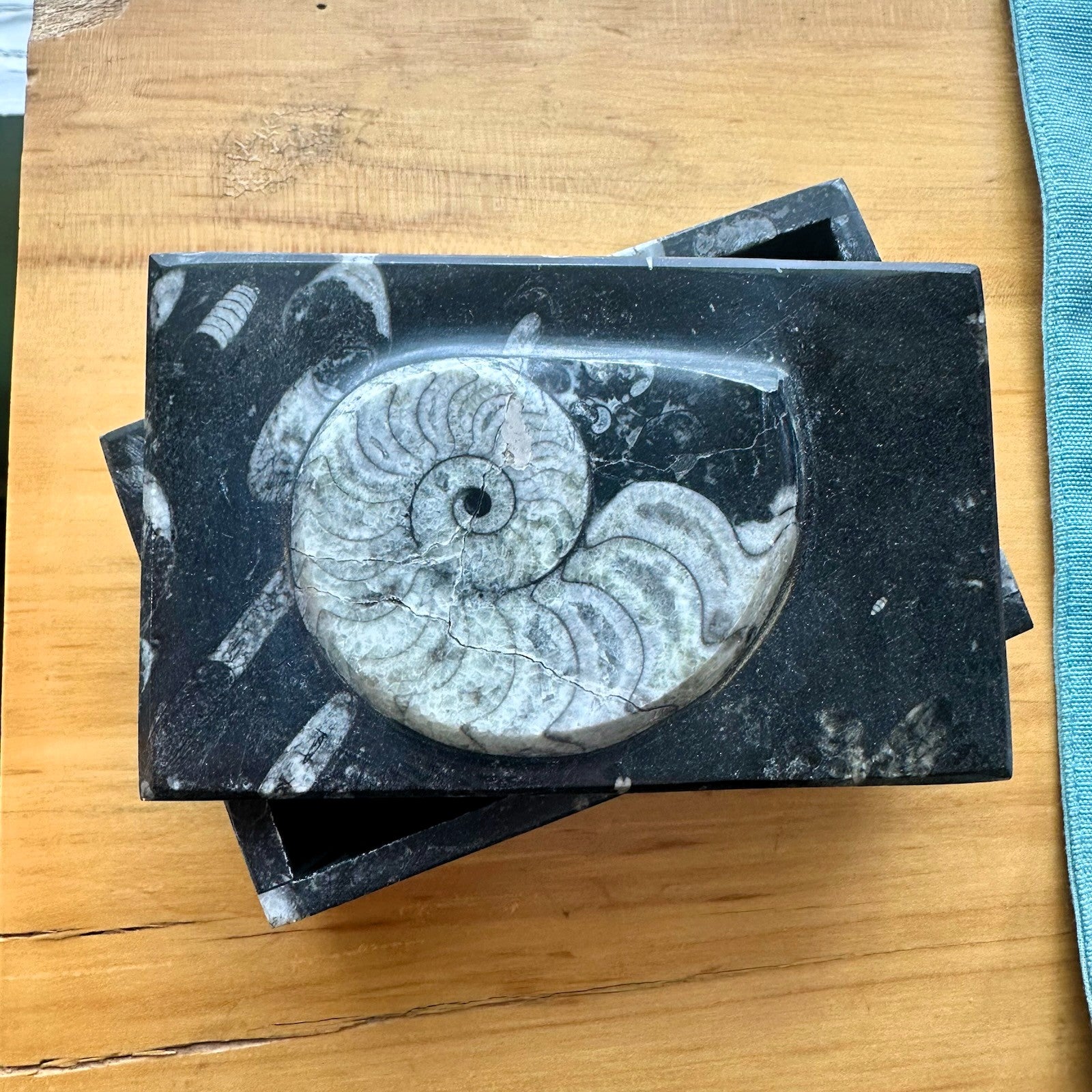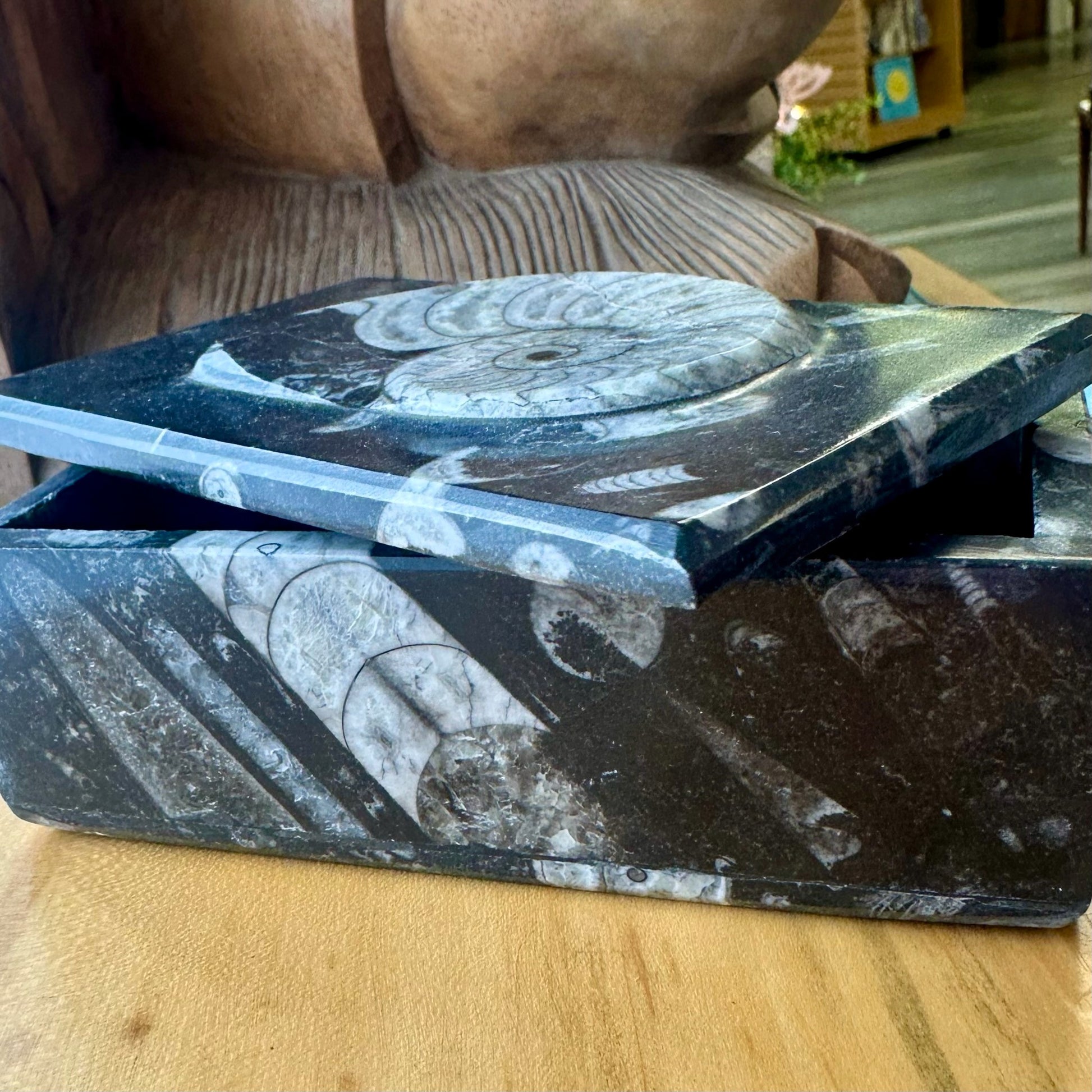 This striking black-and-white Ammonite fossil box is perfect for storing jewelry, trinkets, or keepsakes. With its natural swirling pattern and sturdy design, it adds a touch of ancient beauty and elegance to any space. A unique blend of nature and function for collectors and décor lovers alike.
