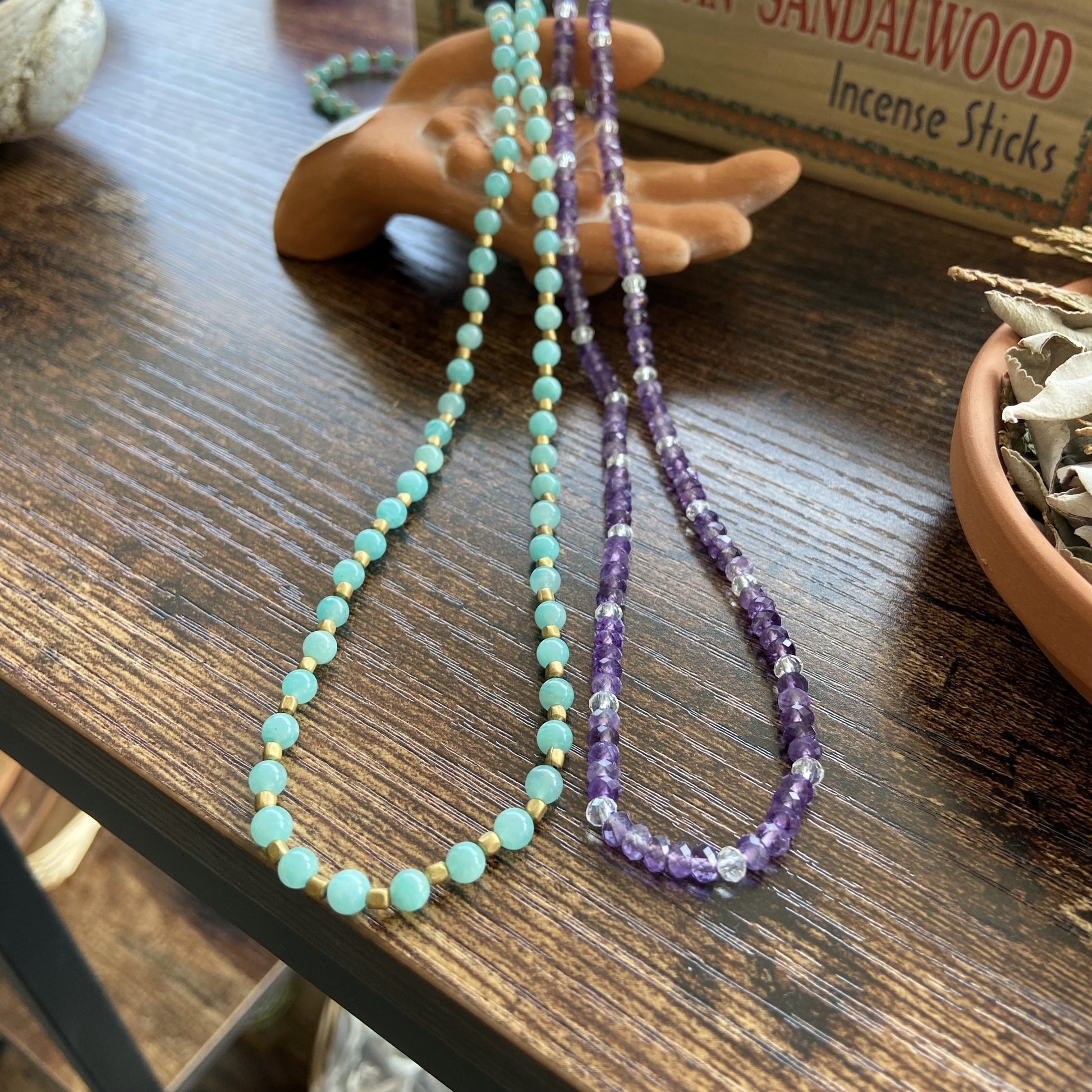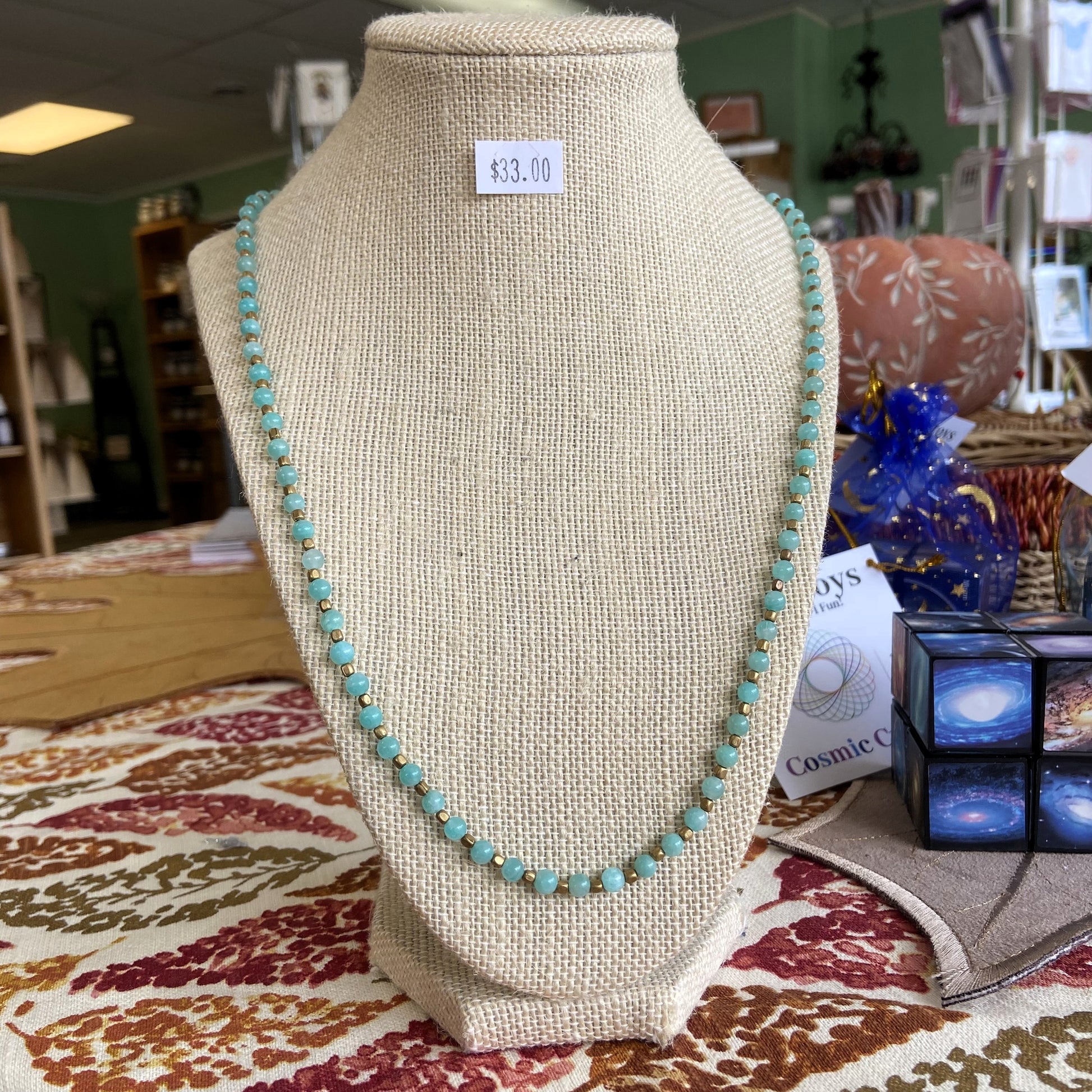 🌿 Amazonite (4mm Polished) - This elegant necklace features 4mm polished Amazonite beads, prized for their calming hues and natural beauty. Brass spacer beads add a warm, vintage touch that makes it perfect for both everyday wear and special occasions.